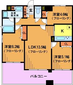 ベランダスペースは3部屋全て(リビング、5.1帖の洋室、6.2帖の洋室)全てから出れるように