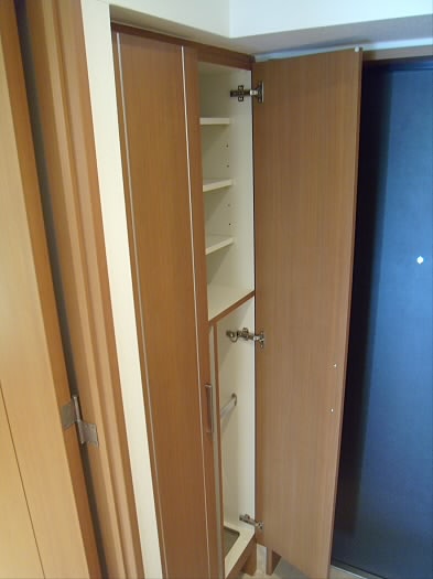 玄関スペース。シューズBOXと物入れがあり、多くの荷物を収納可能です。
