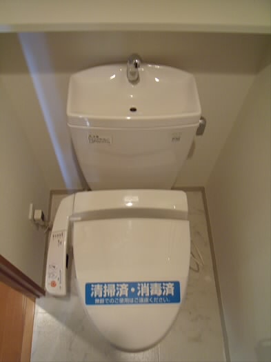 トイレにはウォシュレットも完備。頭上には棚もついており、ちょっとした小物から