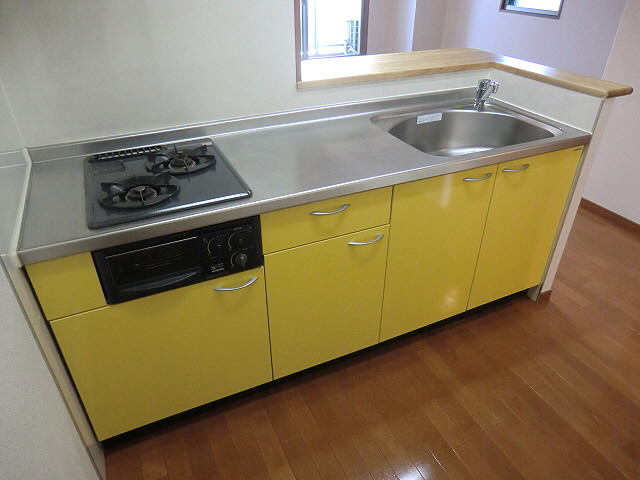 システムキッチンになっておりまして、ガスコンロも3口あります、