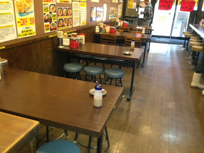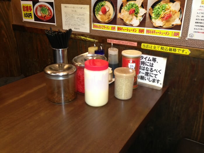 テーブルにはとんこつラーメンには欠かせない辛子高菜や紅ショウガ、ゴマが置いてありますが、
